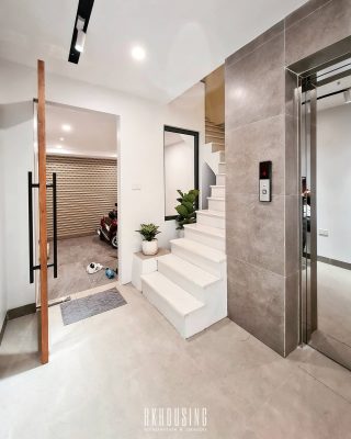 -Tầng 1: Garage, sảnh đệm + thang máy / thang bộ, phòng bếp ăn, wc.